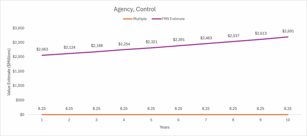 For simplicity’s sake, we will use a revenue multiple, even though value is derived from an agency’s cashflow or EBITDA.