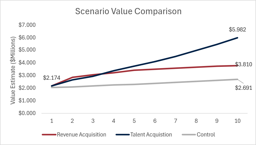 As demonstrated above, a revenue acquisition does not come close to the 10-year value-add of a talent acquisition. You may be wondering, “But the acquirer gave away 5% of their equity, so how?” They did, and that still yields a 10-year value estimate for the acquirer of $5,682,900, which is a 111% increase over the control scenario. The key driver in this talent acquisition is the organic growth of the sellers. The sellers grow their book of business at a 15% sales velocity over the next 10 years. While this may be wishful thinking, realistically, the sellers will have some years below this pace and some above. In a situation where there is high cultural, strategic, and compensation alignment, it is not unreasonable to expect this growth trajectory. The book begins at $250,000 in revenue and ends at $650,000 in revenue by the end of year 10. This suggests the partnership had a strong multiplier effect. As a result of a multiplier effect, an assumption in our model is used that increased the acquiring agency’s annual growth rate from 3% to 4% for years 1-10 as they benefitted from the seller’s organic growth prowess.