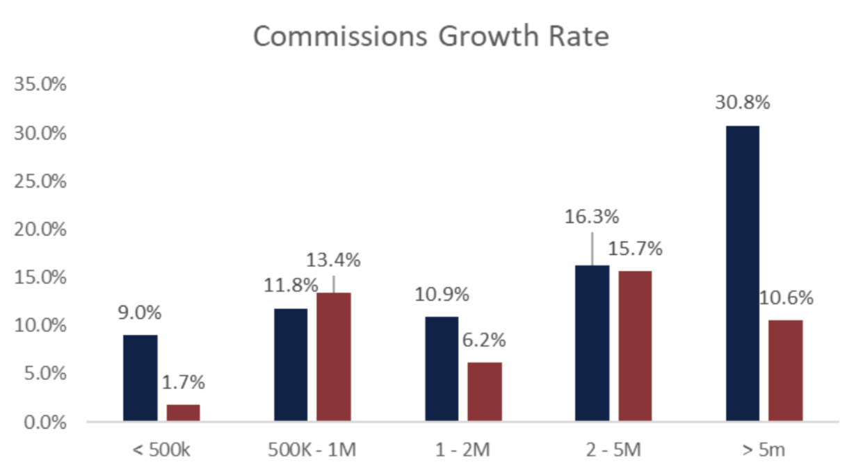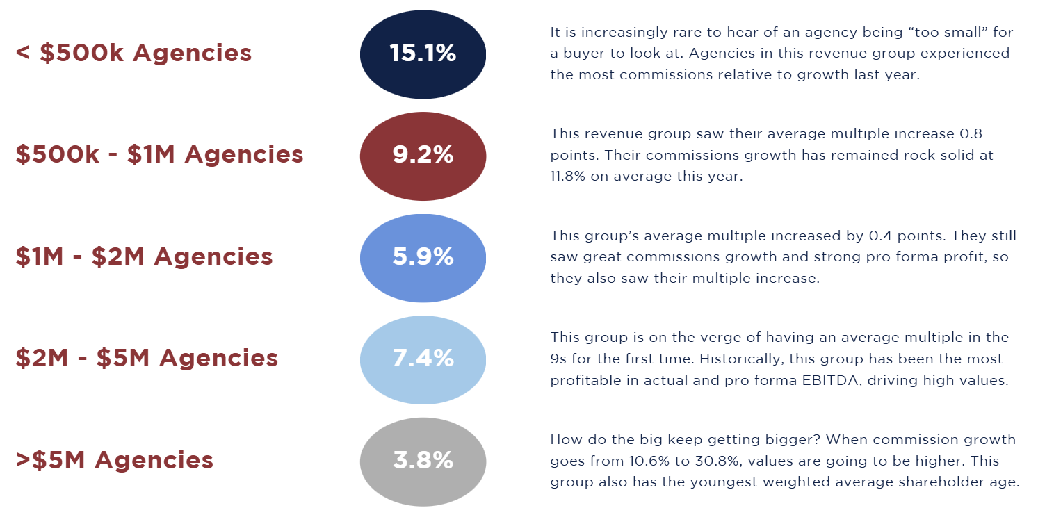Across all revenue groups, the average commissions growth went from 9.2% all the way up to 13% in the latest valuation year. You are a part of a great industry. For agencies evaluated in 2025, they represent another epic year of commissions growth. The smallest and the largest groups set the pace in the latest valuation year. There is still high growth due to the high rate environment of the hard market. For the largest revenue band, acquisitions also played a meaningful role in their commissions increases.