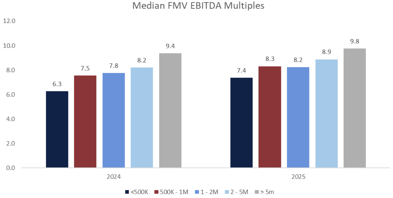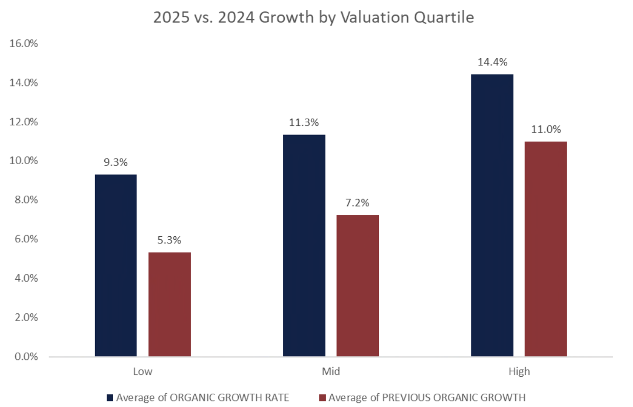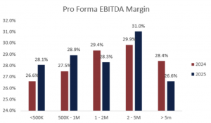 In 2025, the average organic growth rate across our sample was 13%. This is still remarkably strong. The 2025 numbers reflect a mixture of 2024 and 2025 valuations. The industry still beat 2023 – 2024’s growth. Can this upward momentum continue? It’s possible, but it is more likely that we’ve seen the peak in 2025 for some time. The market is softening and many agencies grew primarily due to rate hikes. These agencies may become more exposed as we head into 2026.
