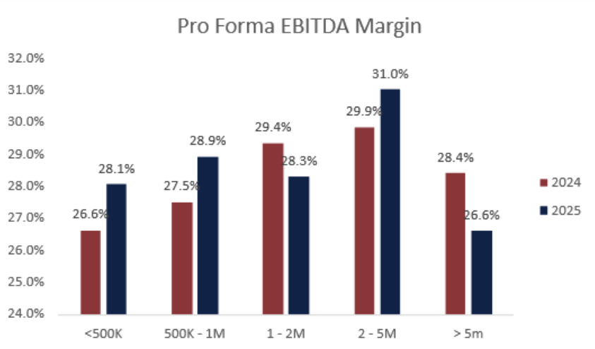 Pro forma EBIDA margin reflects an agency’s profitability after owner discretion expenses and non-insurance related revenues are removed from the agency’s financials. We can see that pro forma profitability has yet to dip below 25% for insurance agencies in our sample. The most profitable agencies have been the $2M – $5M revenue group, as they are beginning to benefit from economies of scale. However, as they grow, their profitability declines due to rising expenses associated with scaling.