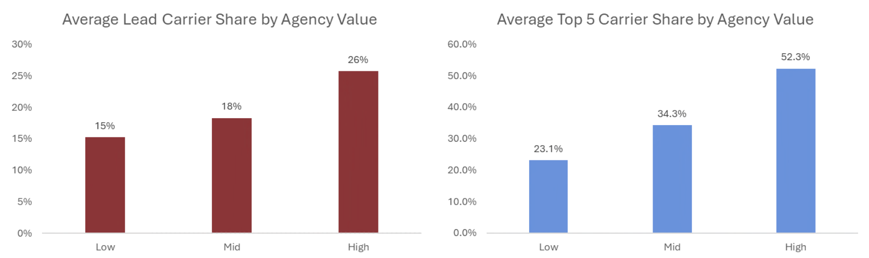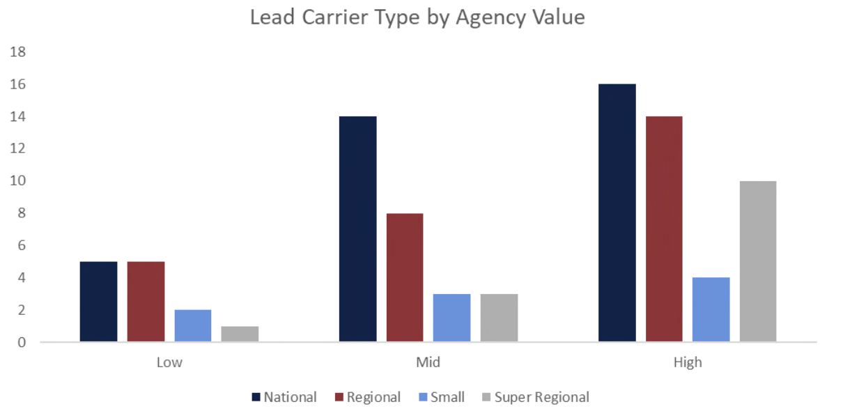 National and Regional Carriers are common lead carriers, but having Super Regionals as a lead carrier is a distinct characteristic of high-value agencies.
