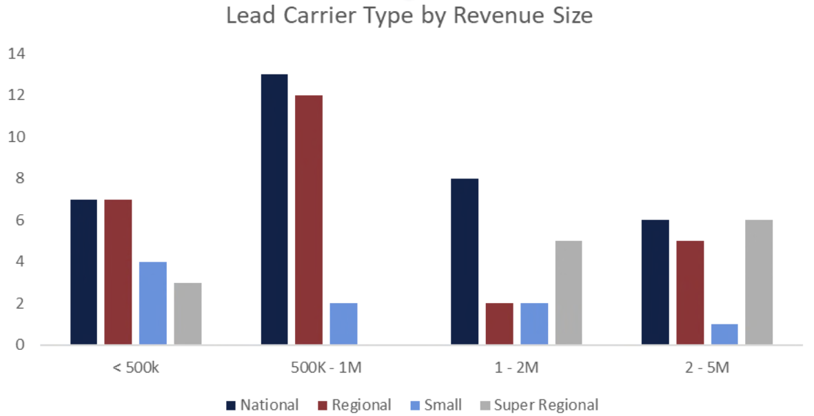 Regional carriers are a key piece of a carrier lineup, but as we move up the value range, they are overtaken by Super Regional carriers. Regional carriers are the second most common lead carrier as agencies increase in value. It is very uncommon to be a high-value agency and have your lead carrier either as a national or small carrier.