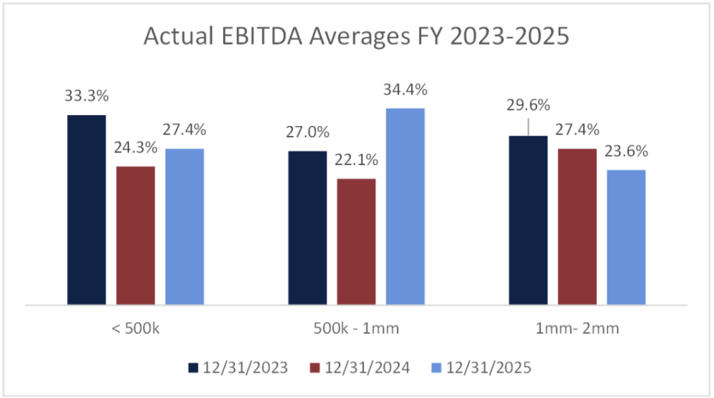 The $500k – $1M group experienced the widest range of actual EBITDA outcomes over the last three years. Margins dipped from 27.0% in 2023 to 22.1% in 2024, before surging to 34.4% in 2025.