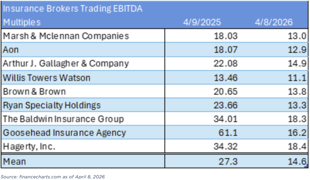 Over the last year, publicly traded insurance brokerages experienced a material contraction in EV/EBITDA trading multiples, with the average declining from 27.3x in April 2025 to 14.6x in April 2026. This pullback reflects broader market pressures, including higher interest rates, increased cost of capital, and heightened investor scrutiny of long-term growth assumptions.