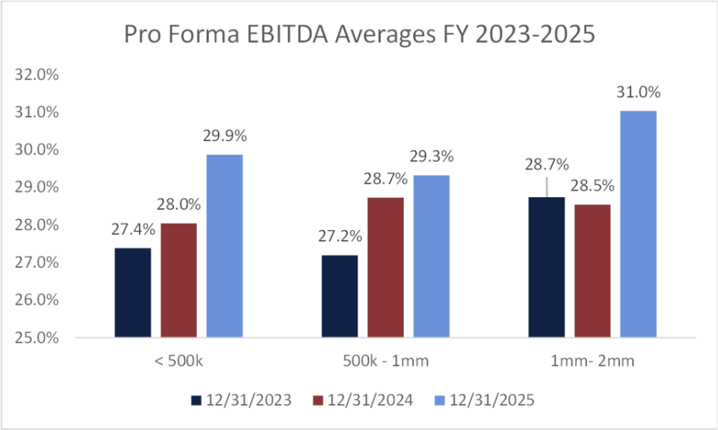 Agencies in the $1M – $2M revenue range posted the strongest pro forma profitability gains among the analyzed tiers. After holding relatively flat from 28.7% in 2023 to 28.5% in 2024, average pro forma EBITDA margins jumped materially to approximately 31.0% in 2025.